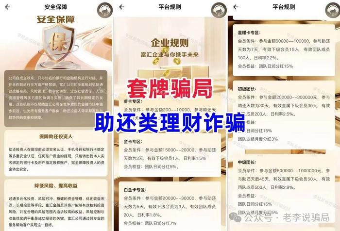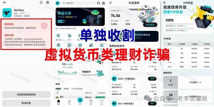 发表时间:2025-11-04 11:41来源:李旭反传防骗团队 最近我们后台收到的咨询和举报量明显上升。很多朋友都反映,现在这些投资理财的APP,看着太“正规”了!不但公司名字是真的,甚至还能在网上查到工商信息,可最后钱投进去,还是血本无归。 事实上,在当前的骗局中,最狡猾也最具欺骗性的就是这类“套牌”骗局。 一、为什么现在“套牌”骗局这么难防? 这些骗局一般会直接盗用香港、澳门、甚至内地一些真实存在的、有一定知名度的金融公司或大型企业的信息,1:1克隆一个虚假的APP。 当你心生疑虑去网上核实这家公司时,查到的基本都是真实存在的信息,信任度瞬间大大提升。 但你不知道的是,你查到的那个正规公司,跟你下载的这个APP,根本没有半毛钱关系。骗子只是借了它的“壳”,内核依然是个骗钱的陷阱。 二、剥开“马甲”,看穿骗局的三个不变内核 任凭马甲怎么换,骗子的核心目的其实永远不会变:骗你的钱。 只要抓住以下三点,再真的“马甲”也骗不了你: 01高额返利”是诱饵,认准人们贪念 无论是承诺高息理财、还是送原始股、扶贫款,核心都是一个“利”字。动不动日息1%、月收益翻倍,这种违背基本经济规律的承诺,本身就是最大的漏洞。 自问一句:真有这种好事,凭什么轮到我? 01“下载方式”是破绽,不敢光明正大上架 这是识别“套牌”APP最直接的一招。 所有这类APP,都不敢在手机官方的应用商店上架。它们只能通过骗子发的链接、扫描二维码的方式,让你点击一个“未受信任的企业开发者”应用来安装。系统会明确提示你“此应用未备案”、“开发者未受信任”,或者直接提示“高风险”!这就是最响的警报! 一个连正规渠道都不敢上的金融APP,能是正规的吗? ↓ 点击图片查看关于此类骗局APP更多案例: ![]() ![]() 01“资金流向”成谜,没入对公账户 当你充值投资时,仔细看收款方。如果是个人银行卡、第三方支付账户,或者让你购买虚拟货币再转入陌生地址,那一定是骗局。正规公司的资金往来,一定是进入其对公的企业银行账户。钱进了个人口袋或虚拟币黑洞,追都没法追。 相关阅读《【骗局全解析第二章】干货再次来袭!警惕虚假“包装”下的高利诱惑!》 以下是近期高发的25个诈骗项目,玩的都是这个套路,请务必谨慎甄别! 虚构的“央行万亿逆回购” 假冒“中国人民银行”名义制作虚假APP,承诺“实名注册即可获得188万元人民币”。APP下载提示未备案,IP地址在境外。 套牌的“富汇”APP 冒充台北“富汇”公司,盗用公司信息制作假冒APP。假借“助还信用卡”噱头吸引参与者加入。诱骗用户购买虚假投资理财项目敛财。 ![]() 套牌的“京睿云”APP 冒充香港“信安亚洲”公司,盗用其相关信息,制作假冒APP,发布虚假投资理财项目,以高额回报诱导人们投资。 ![]() 套牌的“云计算”APP 冒充“阿里巴巴”公司的骗局。违规发行“云币”,实际毫无价值。同时推广虚假理财项目敛财,收款账户为第三方个人,与“阿里巴巴”毫无关系。 ![]() 套牌的“艾克”APP 冒充正规“艾克投资”公司名义,制作虚假APP,虚构推广高息理财项目。 套牌的“Blue pool”APP 假冒“蓝某资本”,虚构推广高额返利理财项目,依靠多层级会员制度进行返利。收益高度依赖新人入金维持,属典型庞氏骗局。 用户通过充值虚拟币完成交易,资金流向不明。APP未备案,下载链接更是经常失效。 套牌的“AMC中国资产”APP 冒充“中国资产管理公司”,声明实名注册即可获得原始股,以发放现金奖励激励用户发展下线。虚构高息理财项目诱导用户投资。 APP下载提示未备案,IP地址显示在境外。 ![]() 虚构的“追梦未来”APP 冒充某国家部门,打着发放“扶贫款”旗号,诱导参与者提供详细个人信息,参与者很可能因此面临涉嫌参与“洗钱”的风险。APP下载提示未备案且携带病毒。 ![]() 套牌的“APD生态” 打着境外某公司名义,以“拆分理财吸引参与者投资,致使大量用户损失惨重。近期推出虚拟货币,谎称打造主流稳定币,再次引诱参与者投资。 套牌的“辉煌火炬” 冒充澳门“辉煌火炬”公司名义,制作虚假APP。推出虚拟货币智能合约、AI托管高额返利项目,诱导参与者入金。 套牌的“SCBS”APP 冒充境外“SCBS”银行的套牌骗局。盗用其公司信息发行虚假投资理财项目,以高额回报吸引人们投资。资金往来依托在虚假币链上完成,流向不明,难以追回。 ![]() 虚构的“智能中国”APP 打着“打造数字中国、智能中国建设”的名义,虚构推广各种根本不存在的高息理财项目。设置各种十分丰厚的高额奖励刺激参与者拉新。同时将“智能通”APP作为参与者专用聊天软件,以此规避打击。 ![]() 虚构的“亚洲数字银行”APP 冒充“亚洲数字银行”发行所谓的“亚数U卡”和稳定币,宣称卡内含30万支付额度。用户必须绑定支付软件和银行卡,其目的在于套取用户个人信息和支付权限。 套牌的“华能”APP 冒充“中国华能集团”公司名义,盗用其信息制作虚假APP,推广虚假理财项目,承诺高额回报。APP只能通过第三方链接下载,下载提示未备案,IP地址显示在境外。 ![]() 套牌的“赛博” 股票跟单骗局。冒充香港某公司的名义,打着聚沙成塔的旗号,忽悠参与者跟随“专家”炒股。 智瀛融租 虚假融资租赁类理财项目。目前已无法打开。 “维盛Veridian”APP 虚拟币跟单项目。打着“区块链”“社区跟单