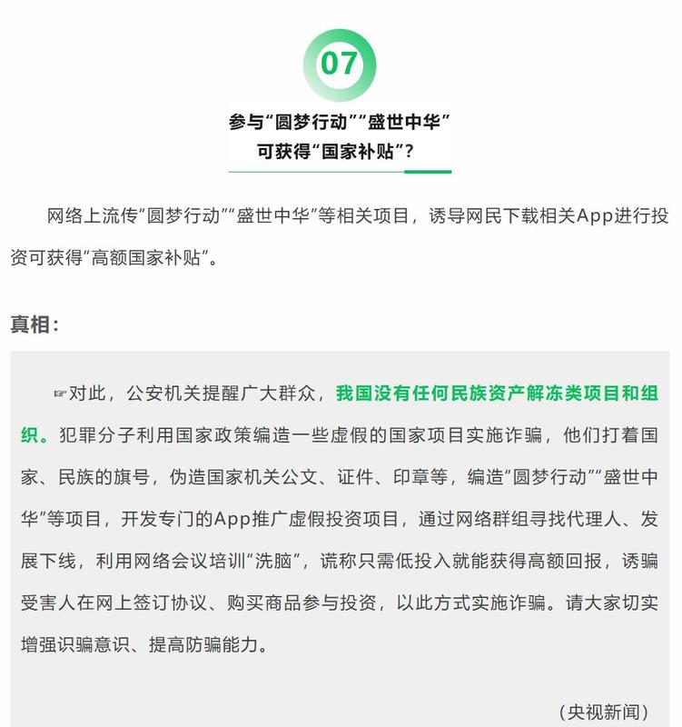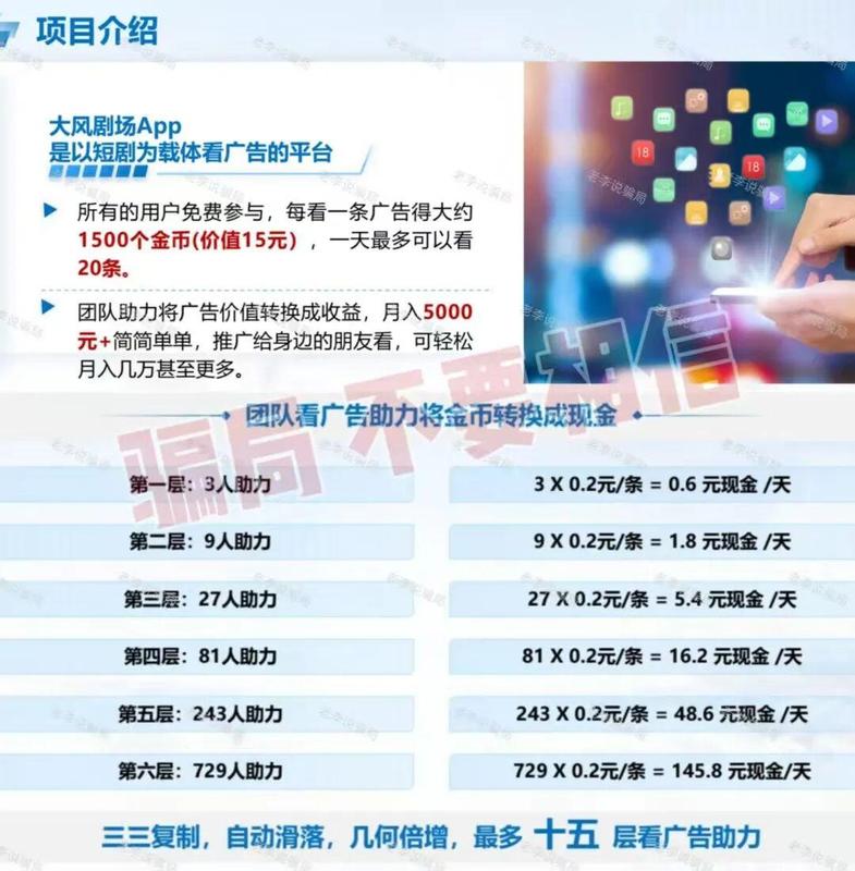 发表时间:2026-01-07 19:41来源:李旭反传防骗团队 这些看似风光的“暴富机会”,为什么最后总是变成“暴负陷阱”? 当您被“国家政策”“高息理财”“拉人躺赚”这些词汇包围时,是否想过:屏幕对面的“正规公司”可能是李鬼,“稳赚不赔”的项目其实是精心设计的杀猪盘? 从套牌正规企业的虚假投资,到看似高精尖的传销币;从打着“平债”旗号的“洗脑”,到利用短剧、广告做掩护的庞氏骗局……骗局的手段也在升级。 但“画大饼、拉人头、借新还旧”的核心逻辑从未改变。他们利用人性的贪婪与焦虑,将一个个看似完美的“财富神话”变成让无数家庭支离破碎的深渊。 2026年刚刚开始,新的“诱饵”就已经洒下来,速来自查,及时“排雷”! 套牌的“正隆林业”APP 冒充“正隆林业”,利用其信息开设虚假项目。 该平台声称为“新能源项目”,在其APP上有多款林场、树木租赁的理财产品,以高额回报吸引用户投资。 每款产品设定锁仓期,每日返息,但如此高的收益率已经不是正常林业经营能够达到的水平。 本质上依旧是一个借新还旧的庞氏骗局,一旦新人不足,参与者面临血本无归的结局。 ![]() 虚构的“光彩事业”APP 利用免费“豪车、原始股、家电”等极具诱惑力的高额回报吸引参与者实名注册拉拢新人。 IP地址在境外,是典型搭建在境外的诈骗,请勿参与。 虚构的“水产联盟”APP 虚构多款“水产养殖类”“船舶建设类”理财产品,设定超高的年化率吸引参与者进行投资。 但APP未通过备案,收款方账户也是不同的第三方公司和个人,是比较典型的虚假投资理财项目。如此不正规且缺乏监管的项目,投资者全部的寄托只有一个APP,一旦关网,参与者根本没有任何途径维权,风险很高,遇到请远离! ococat web3 菠萝猫 违规发行“CAT代币”,炒作“PSC”,通过“质押挖矿”模式承诺高收益。 参与者需以1000美元/张的价格购买XOS证书或IVO矿机,作为参与“挖矿”和获取收益的前提。 通过团队业绩和推荐人数划分等级。直推可获15%奖励,间推按层级递减发放算力。一级矿场主可从团队每笔IVO矿机认购中抽取4% USDT,二级矿场主额外获得小区业绩分红,更高层级按团队规模瓜分全球算力分红。 该项目以“Web3.0与AI融合”为噱头,进行虚拟货币交易,属非法金融活动,承诺保本高收益涉嫌非法集资、传销。 ![]() 大风剧场短剧推广 主打“短剧+广告”形式,用户通过观看广告获取金币。1500金币≈15元,但想要兑换成现金,必须通过“团队助力”才能完成。 同时,平台采用“三三复制”的多层级模式,用户拉新形成1-15层团队,团队成员看广告时,上级可按层级获得助力收益,宣称达到第六层729人助力,可日赚145.8元。 ![]() 此模式就是典型的“多层级团队计酬”的推广方式,符合“拉人头、团队计酬”的高风险特征。 宣传的单日收益远高于主流看广告类平台,广告主实际投放成本无法覆盖高收益,本质是“后入者资金补前入者”的庞氏逻辑,资金链极易断裂,有随时跑路的风险。 当我们下载APP后,发现图标背景与之前曝光的多款涉诈APP完全一致,可见为批量生产,请务必远离! ![]() 套牌的“亚果生医”APP 冒充香港“亚果生医”公司,盗用其信息制作虚假APP,推广日化收益率超1%的高息理财项目。收款方与该公司毫无关系,全部都是不同的个人账户或第三方公司账户,APP没有通过备案,只能依靠二维码或者链接在个人之间传播,符合虚假投资理财特征。不要参与! ![]() 虚构的“精准扶贫”APP ![]() 虚构的“圆梦行动(圆梦统计)”APP 详情→ ![]() 桂林临桂33500传销组织 网友在某相亲平台认识王某,聊天一个月后,以“奔现”为名前往临桂。在游玩一天后,王某带来一个陌生男子开始向网友讲解桂林政策、西部大开发等内容。午饭后,一位中年女士又来讲解人民币,并开始向其灌输投资33500元出局可得1200万元回报。网友这才意识到自己陷入传销组织。但出于安全考虑,网友仍假装感兴趣,并未戳穿。 第二天,传销组织开始带领网友前往各个景点“转现象”,随后,各种“讲师”接踵而至,网友实在厌烦便以家中有事逃离桂林。 回到家中的次日,网友发现自己已被王某拉黑。 此流程为传销组织惯用套路,他们通常会通过网恋交友、介绍工作、旅游等借口,将人骗到桂林进行“洗脑”,打着“西部大开发”“临桂机会”“移民经济”等旗号,鼓吹投资33500元,发展下线,出局可以获得1200万元的回报。 秦皇岛平债传销骗局 网友家人因负债被朋友以“平债”名义骗至秦皇岛。在听了几天“课程”后,坚信项目为“国家政策”,并对“宏观调控”说深信不疑,不顾原有债务,在传销组织成员怂恿下,仍不断贷款,目前债务已高达100多万元。 网友无力劝阻,因此寻求专业劝说老师帮助。 据了解,该传销组织通常打着“平债”“消除不良信息”等名义,忽悠新人交纳2900-43500不等加入该传销组织,谎称达到一定级别后,不仅能平掉债务还能获得最高1.5亿回报。 详情→隐形红利?国家兜底平债?起底河北“中绿”传销如何用“政策话术”掏空受害者钱包!