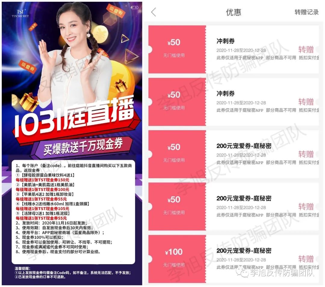 据媒体报道,上海某地派出所接报案称,他们在定期对公司所运营的APP后台进行梳理时,发现2020年11月至12月期间, 有约1600笔利用公司发售的抵用券进行购买的记录存在异常。 经后台比对,发现有2个客户反复使用同一抵用券进行刷单。经查, 犯罪嫌疑人朱某、李某利用系统漏洞分别骗取该公司640万元、130万元价值的货物。 目前,犯罪嫌疑人朱某男、李某女因涉嫌诈骗罪已被青浦警方依法采取刑事强制措施,案件正在进一步侦办中。 李旭反传销团队了解到,两人所在平台为“TST庭秘密”APP,而且朱某男、李某女均在TST代理商。 一直以来“TST庭秘密”张庭林瑞阳夫妇都对外宣称代理商就是他们的家人,林瑞阳在TST代理圈也一直是以大哥自居,经常会看到他给代理“亲切”分享生意经的信息。