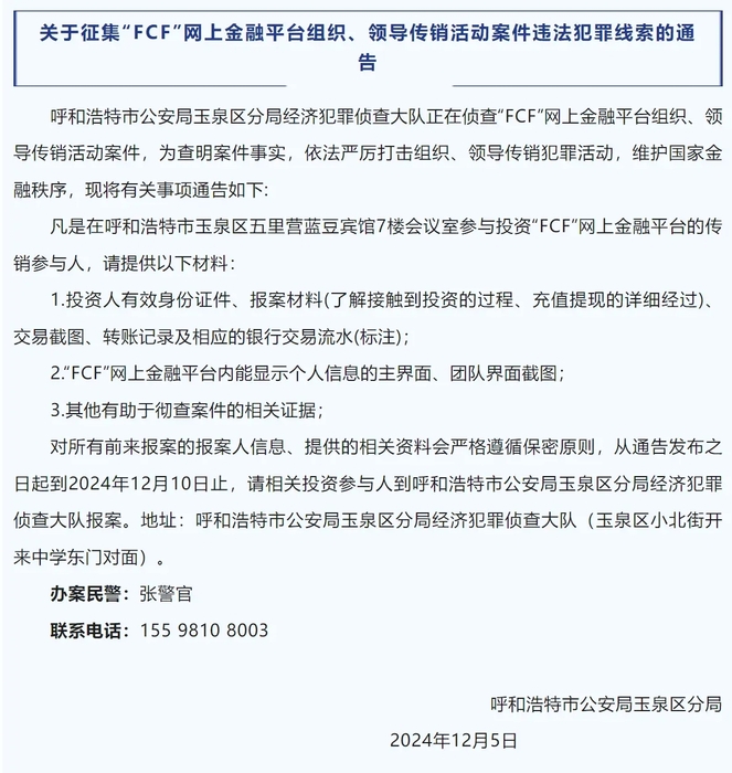 发表时间:2024-12-09 13:48来源:平安玉泉 关于征集“FCF”网上金融平台组织、领导传销活动案件违法犯罪线索的通告 呼和浩特市公安局玉泉区分局经济犯罪侦查大队正在侦查“FCF”网上金融平台组织、领导传销活动案件,为查明案件事实,依法严厉打击组织、领导传销犯罪活动,维护国家金融秩序,现将有关事项通告如下: 凡是在呼和浩特市玉泉区五里营蓝豆宾馆7楼会议室参与投资“FCF”网上金融平台的传销参与人,请提供以下材料: 1.投资人有效身份证件、报案材料(了解接触到投资的过程、充值提现的详细经过)、交易截图、转账记录及相应的银行交易流水(标注); 2.“FCF”网上金融平台内能显示个人信息的主界面、团队界面截图; 3.其他有助于彻查案件的相关证据; 对所有前来报案的报案人信息、提供的相关资料会严格遵循保密原则,从通告发布之日起到2024年12月10日止,请相关投资参与人到呼和浩特市公安局玉泉区分局经济犯罪侦查大队报案。地址:呼和浩特市公安局玉泉区分局经济犯罪侦查大队(玉泉区小北街开来中学东门对面)。 办案民警:张警官 呼和浩特市公安局玉泉区分局 2024年12月5日