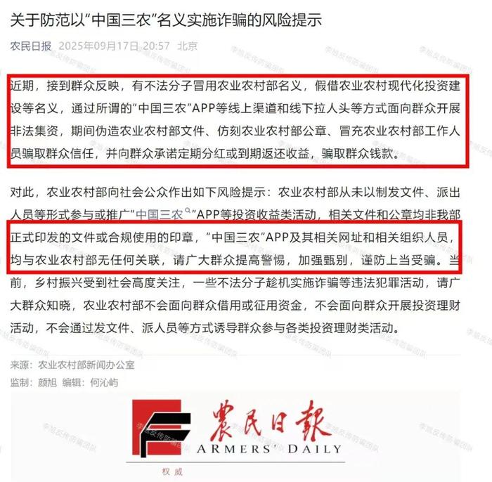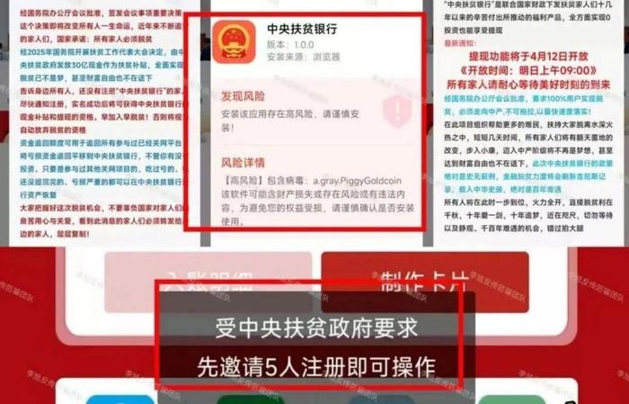 发表时间:2025-09-23 19:08来源:李旭反传防骗团队 老人家辛辛苦苦攒了一辈子的钱,却在几天之内就被骗光…… 这不是危言耸听,是每天都发生在身边的真实案例 每天他们准时拿起手机,认真签到、看视频、做任务、开会,“忠实”的相信那背后是国家的承诺、是扶贫的好政策 而手机的另一边,骗子冒充政府、国企甚至银行,编造谎言、伪造APP,正在试图一步步掏空老人的积蓄 参与者们省吃俭用了一辈子,却心甘情愿地把积蓄投进那些看不见的“项目”里,只为那一句——“将来能分红”“马上能发钱”…… 可真相是:那些APP是假的,公章是假的,承诺是假的,甚至连所谓的“集团公司”都根本不存在! 今天,我们整理了近期正在活跃的50个骗局 请您一定耐心读完,并转发出去,提醒父母、亲戚、身边的朋友 有些“好事”,不能信;有些“机会”,是陷阱 别让“辉煌”了一辈子的长辈,最终伤在骗局里 01、虚构的“终谷集团” 前身“仁礼集团”。每天就是不停地让参与者签到、学习、下载各种APP、看广告等等。 参与者被项目方画的“大饼”牵着走,但是,一家根本不存在的集团,又如何履行承诺呢? 不要再免费给骗子“打工”了,不可能兑现的。 ![]() 02、虚构的“爱满中华”APP 无法打开的“爱满中华”在所谓的升级之后又重新上线。 这次虽然没有让参与者继续交钱,但仍旧在忽悠,声称3个月内发放扶贫款。 骗了这么久,割了一波又一波,大家还是醒醒吧。 ![]() 03、虚构的“云济会” “云数贸”系列诈骗。打着还在“小黑屋踩缝纫机”的“张健”旗号推出的虚假项目。 收款账户几乎都是来路不明的个人账户。 15日,该项目假借“上市”之名停止提现,同时下架全部投资产品,处于软跑路状态。 APP中那些所谓的余额、分红在这时全部成了一串毫无意义的数字。 ![]() 04、“中国数贸CDTT”APP 谎称“上市”无法提现至今已经三个月了,坑了一大批参与者。 ![]() 05、虚构的“中国三农” 农业农村部新闻办公室发布风险提示,明确表示“中国三农APP”系不法分子冒用农业农村部名义推出的诈骗项目。 相关阅读《关于防范以“中国三农”名义实施诈骗的风险提示》 ![]() 06、虚构的“高质民生”APP 上线仅3个月便开始冒充“金融监管总局”,打着“发放扶贫款”名义,要求参与者根据6个通道缴纳所谓的“监管费”,共计5499元。 一个号称不投资的平台正式开启敛财之路。 ![]() 07、套牌的“国能”APP 面对正牌“国家能源集团”和各地官方不断发布的预警声明,参与者仍我行我素不顾劝阻。 近日,该项目无法提现,并将分红再次延期至10月1日,大有软跑路之嫌。 相关阅读《假冒央企实施诈骗!警惕!“国能”APP是虚假网络投资诈骗平台假冒央企实施诈骗!警惕!“国能”APP是虚假网络投资诈骗平台》 ![]() 08、“中国人际网”APP “国网”早年被定性为传销的骗局,最近又开始推出所谓的“国网编码”“1万股权”“100万国网分红”“富三代国网GK卡”等项目敛财。 ![]() 09、虚构的“智能中国”APP 打着“打造数字中国、智能中国建设”的名义,虚构推广“崂山智慧康养数字津贴系统”“海淀融通智慧农业基地”“上海一网统管AI增强工程”等高额返利理财项目。 ![]() 10、冒牌的“稀土稳定币”、“京东稳定币”、“蚂蚁稳定币”等虚假“稳定币” 冒充正规集团推出虚假稳定币。 相关企业对此纷纷发布声明,证明其为骗局。 相关阅读《有关稳定币!假的!蚂蚁集团、中国稀土集团、京东发言人相继发布打假声明!》 ![]() 11、套牌的“HW华为币APP” 冒充“华为”集团发行所谓的“华为币”及多个级别矿机,诱导用户通过推荐新人,并根据人数解锁不同等级,用于产出更多虚拟币。 项目与“华为”毫无关系,都是假的! ![]() 12、虚构的“中国稳定币”APP 打着国家名义推出“稳定币”,同时推出四类矿机,花费相应算力购买以获得更多产出。 APP下载提示未备案,且携带病毒。 ![]() 13、虚构的“绿途”APP 打着“碳达峰、碳中和”的旗号,发行“绿途币”,虚构推广高息返利的理财项目。 下载提示未备案且携带病毒。 益阳市资阳区人民政府办公室在7月已经发布预警,提醒广大市民切莫参与! 相关阅读《警惕!伪造政策+传销模式投资陷阱》 ![]() 14、虚构的“数字人民币推广” 相关阅读《辟谣!“成立数字人民币银行、招募数字人民币推广员”系谣言》 ![]() 15、虚构的“中央扶贫银行”APP 打着“国家”旗号伪造“红头文件”,宣称为参与网络项目而亏损钱财的群众发放补贴,以此吸引大批用户实名注册下载。 下载该APP提示存在高风险且携带病毒! ![]() 16、虚构的“中央精准扶贫银行”APP 冒充国家项目发行所谓的“中央精准扶贫币”,虚构数字币价值诱导参与者通过实名注册领取。 APP下载提示未备案且携带病毒。 ![]() 17、虚构的“亚数行”APP 冒充“亚洲数字银行”发行所谓的“亚数U卡”,套取参与者个人信息和支付权限。 ![]() 18、套牌的“慈善联盟”APP 相关阅读《存50多万,几个月返利竟超170万?这个 “红头文件”上的“慈善项目”,假的!》 ![]() 19、套牌的“CCSAC国际工程”APP 又叫“超级工程”“金砖国际”。不断被官方预警就不断更换“马甲”,骗了一波又一波。 ![]() 20、虚构的“助力中医”APP “狡兔三窟”型选手。年年换“皮”年年得手。 ![]() 21、假冒的“建设局”APP 冒充“