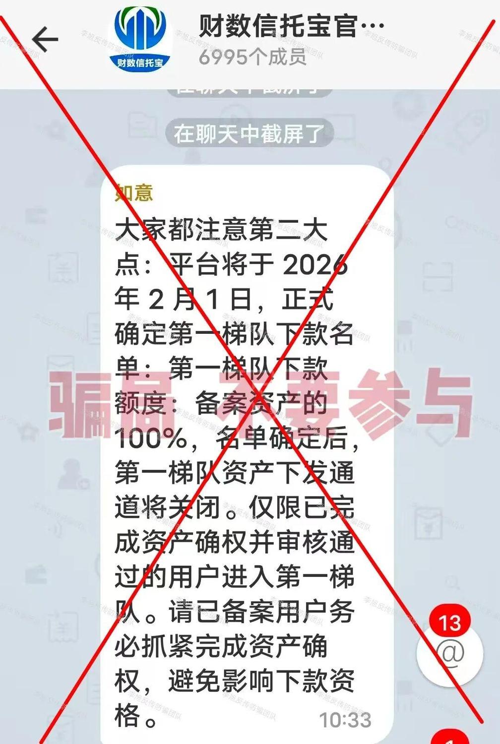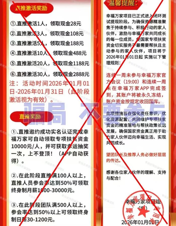 发表时间:2026-01-30 18:51来源:李旭反传防骗团队 年关将至,打击都在盘算着团年货、盼团圆。可不少网络项目也进入了“年终冲刺”的阶段。 最近,后台又收到大量网友的反馈,多个打着“国家项目”“专属补贴”旗号的网络项目非常活跃,扎堆声称“即将放款”“拿结果”,甚至把“领钱日期”精准卡在了春节前后。 再看这些项目的“放款方式”更是花样百出,一个比一个离谱。 有的说“专人派送现金到家”,有的编造“武装押运发放”,还有的竟然声称“专车接送至网店办理”…… 这些情节正常人一听就觉得荒唐,却偏偏让不少参与者深信不疑,甚至觉得自己是“天选之子”,才能享受这般“特殊待遇”。 为何如此明显的漏洞,还是能让人钻了空子? 一方面,节日前大家都忙着收尾工作,对信息识别的能力会不自觉下降,各类项目就趁着这个“注意力空挡”制造紧迫感;另一方面,这一年以来,参与者投入了大量的时间、金钱,看似就差“临门一脚”,所以宁愿自欺欺人的自我说服,也不愿承认踩了坑。种种心态交织在一起,正好给骗子提供了缓冲期。 而且,这些项目大多将所谓“最终兑现日”设定在春节前夕,这也绝非巧合。 届时正值银行系统结算、单位放假、信息沟通不畅的时候,项目方随便找个“银行盘账”“系统升级”“节日延迟”的借口就能轻松拖延,等大家反应过来,很可能已经关网失联。 以下这些项目最近都在频频出招,赶紧对照避坑! 1、套牌的“奥园”APP 该项目近一个月以来,持续以“按梯队派发现金”为名吸引参与者。 然而,除了群内少数“托儿”发布的摆拍视频外,几乎无人真正收到所谓的“回报”。 ![]() 这种利用演员伪造到账视频的套路,早在之前的“扩大内需”诈骗案中就被警方揭露。详情→ 许多参与者仍不愿面对现实,不断为自己未收到钱款寻找借口,甚至协助宣传。 ![]() 骗子正是利用这种心理,通过虚假视频拖延时间,不断吸引新人加入。 可能在参与者看来,最难以接受的并不是自己被骗,而是一场梦的破碎吧。 ![]() 2、财数信托宝 该平台宣称能为参与者发放50万至100万元的“补助金”,甚至承诺为其他网络项目的受损者“找回资产”。这些极具诱惑力的承诺,短时间内吸引了大量用户。 但是至今日,参与者不仅未能获得承诺的收益,反而交了一笔又一笔费用。 近期,该项目也如同“奥园”APP一样,利用“梯队放款”模式,以“下款资产确权”为由,再次想参与者收取498元确权费用。 此类套路在2025年已多次出现,本质是以“高额回报”为幌子,行“小额多次收割”之实。参与者们还是尽早清醒,及时止损吧。 ![]() 3、“建行钱包”APP 冒充中国建设银行,以所谓“内含507万元资金”的虚假银行卡进行宣传。 兑现方式极为荒唐,竟然声称安排“专车司机接送至网点办理”,这完全不符合金融机构的正常流程。 该平台更以“退款”“补贴发放”为名,索要用户的银行卡、身份证、手机号等敏感信息。 要知道,许多诈骗案件中,那些来历不明的收款账户正来自于此类信息收集。一旦出借或泄露个人账户,很可能被用于接收、转移诈骗资金,从而导致户主涉嫌“帮信罪”。 请务必保护好个人信息,避免泄露。 ![]() 4、“华云数字”APP 早在2021年,“华云数字”便因涉嫌传销被警方查处。然而,近期一个同名APP再度出现,打着“数字中国”“国家扶持”旗号,以“注册即送19.8万云元”“领298万返利”为诱饵,吸引参与者。 用户通过每日签到、拉人头获取“云豆”“云元”等虚拟积分,并根据下线人数形成层级,上级可从下线的交易中获取5%-30%提成。 但该平台无任何实际经营业务,IP地址更是位于境外,一旦崩盘,所有“数字资产”将瞬间归零。 说白了,这就是一场用“民族情怀”和“高额返利”包装的骗局,看似零成本,最终只会让自己和身边的人都陷入风险。 5、“环球智投”APP 智天系列骗局变种。以“智天回归”为噱头,以免费用车、现金奖励吸引用户拉新,并赠送可兑换产品的积分。 此类项目通常会先通过“免费福利”快速积累用户,待人数达到规模后,便会推出各种“高收益投资项目”进行收割。 务必警惕:真正的“智天金融”案主犯早已落网,所有打着“智天重启”“智天股权”旗号的项目,均为骗局。 ![]() 6、“幸福万家”APP 民族资产解冻类诈骗,远离! ![]() 7、假冒“某Y联”APP 该APP与此前曝光过的“众益鑫”套路一致。都是先以“公益活动”“爱心助农”吸引关注,后期逐步推出虚假理财产品进行收割。 其软件图标与多个已被定性为诈骗的APP相似,属于同一团伙批量制作的“换壳”产品。 请大家切勿下载! ![]() 8、王某某解毒茶 一款普通代用茶,竟宣称能解“农药、尼古丁、西药”等七类毒素,并虚假借用“央视”名义背书。 ![]() 参与者需以198元/盒购买,并依据九级层级关系享受直推、级差等多种奖励。 ![]() 根据《广告法》及《食品安全法》,普通食品不得宣传任何疾病治疗或“解毒”功效。其销售模式依靠拉人头形成层级,收益来源于后来者的购茶款,已涉嫌传销。所谓“高额奖励”实为空中楼阁,最终只会导致底层参与者损失惨重。 9、“MUTUAL妙趣艺 该项目宣称将影视版权等资产通证化,推出所谓“RWA租赁”项目,承诺每日1%-5%的静态高收益,且所有交易均通过虚拟货币进行。同时设有复杂的“团队奖”“级差奖”等拉人头奖